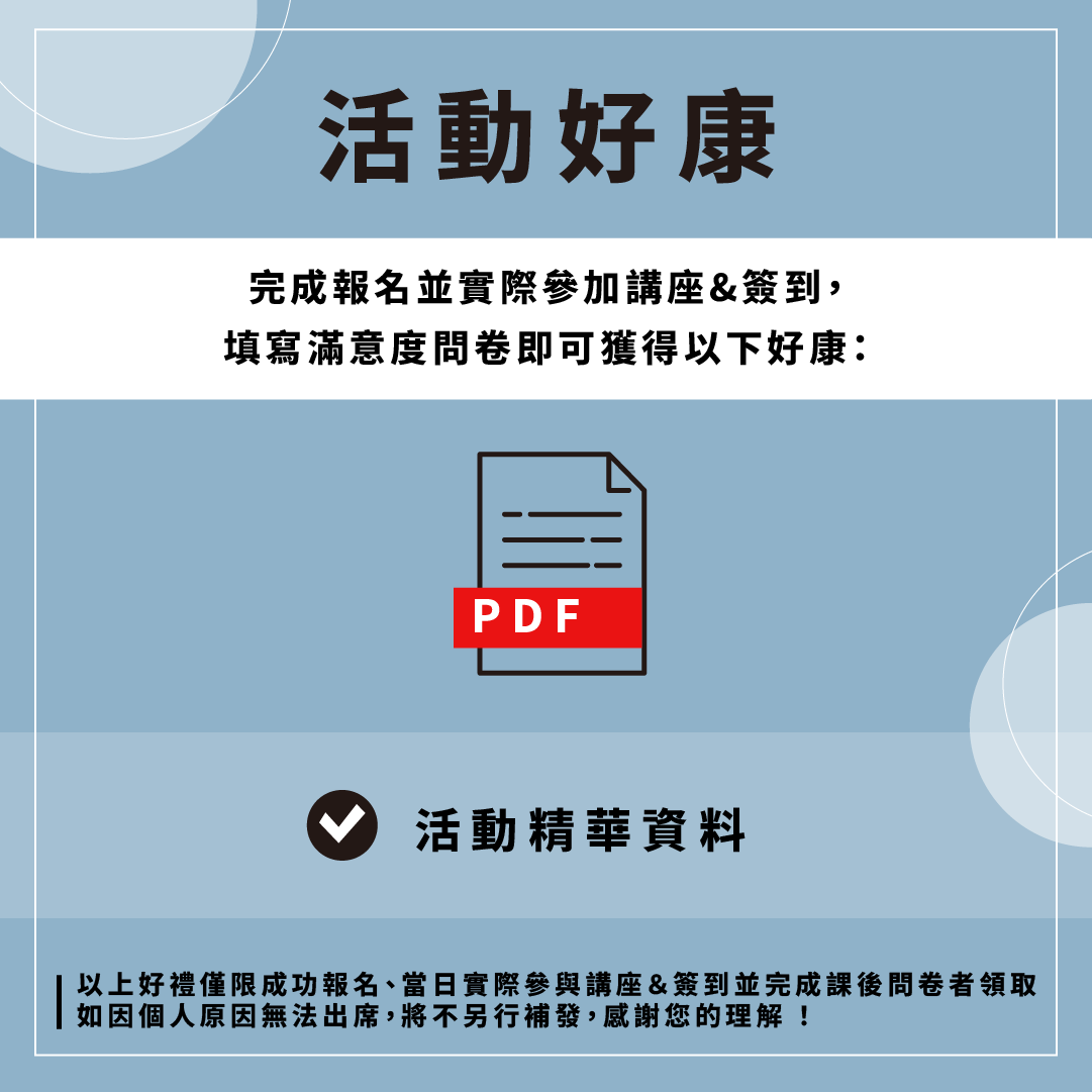 📢 以上好禮僅限成功報名、當日實際參與講座&簽到並完成課後問卷者領取。如因個人原因無法出席,將不另行補發,感謝您的理解!