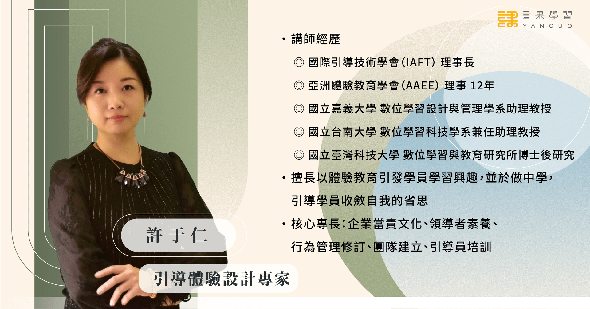 本場講座邀請「引導體驗設計專家—許于仁講師」,分享一套引導流程模型,帶你掌握六階段設計法,從「講授型」走向「引導型」、從「指令型」轉為「啟發型」、從「討論型」邁向「行動型」,重新思考團隊與教學的帶領方式。