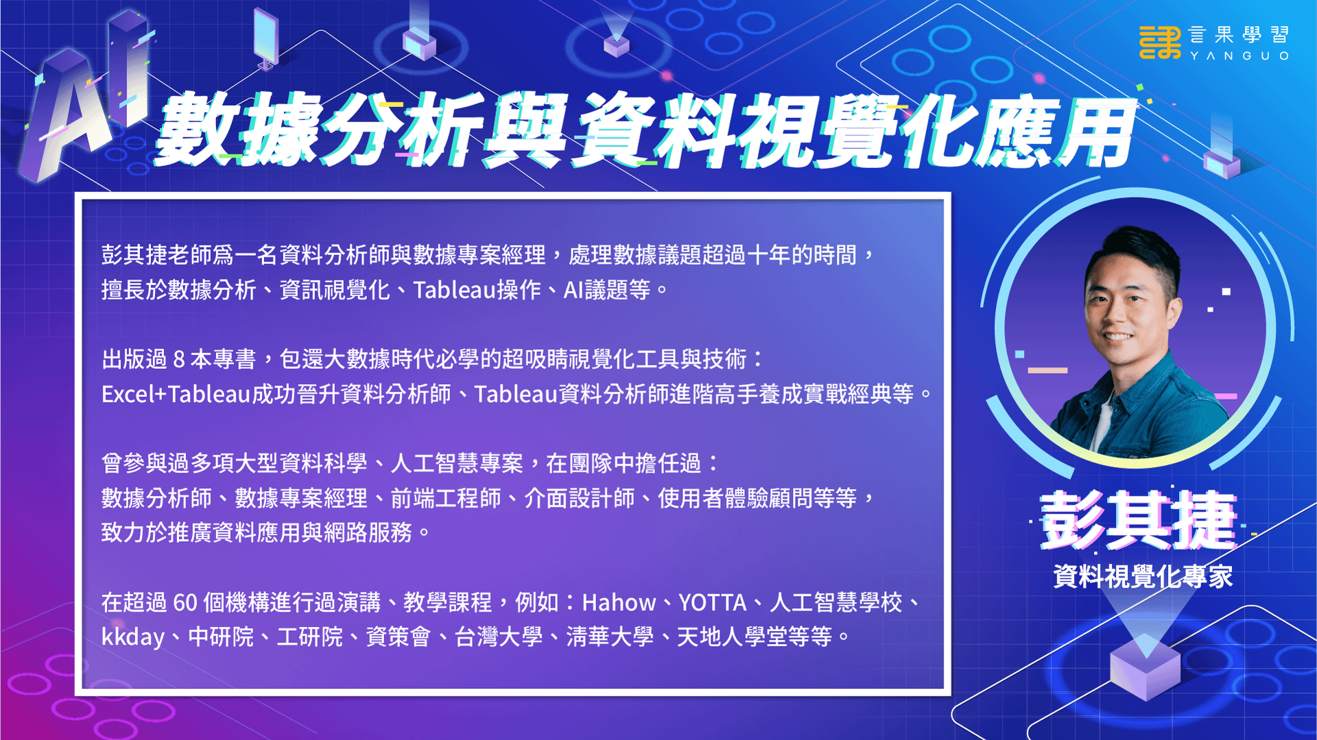 本堂課程邀請資料視覺化專家彭其捷老師來教您如何透過ChatGPT進行數據分析和資料視覺化,讓你有機會開始把數據分析工作變得更容易!
