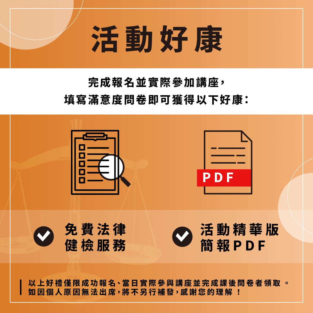 - 完成報名並實際參加講座,填寫滿意度問卷即可獲得以下好康: