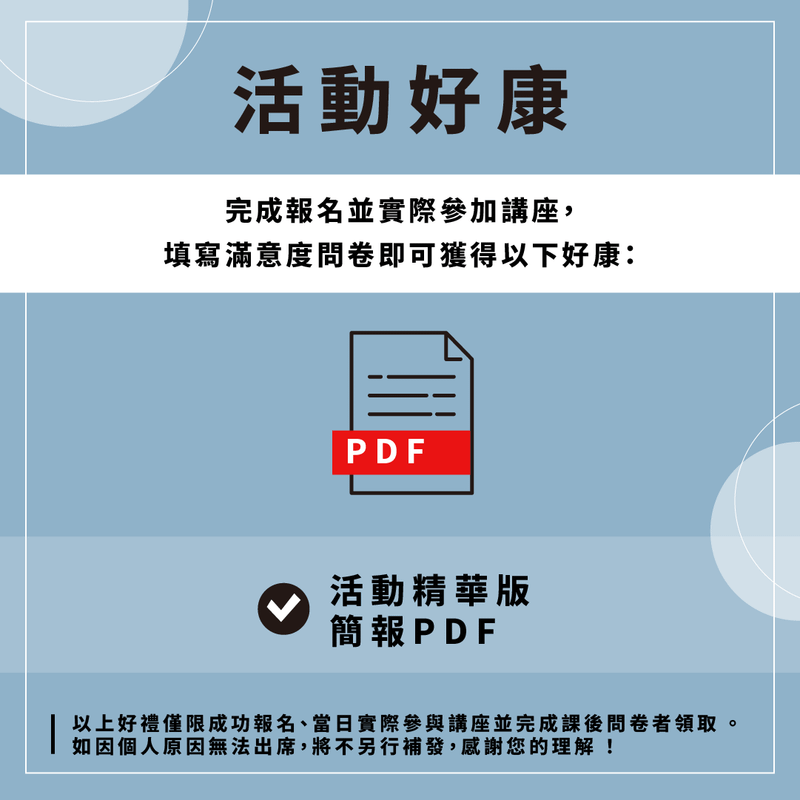 📢 以上好禮僅限成功報名、當日實際參與講座並完成課後問卷者領取。如因個人原因無法出席,將不另行補發,感謝您的理解!