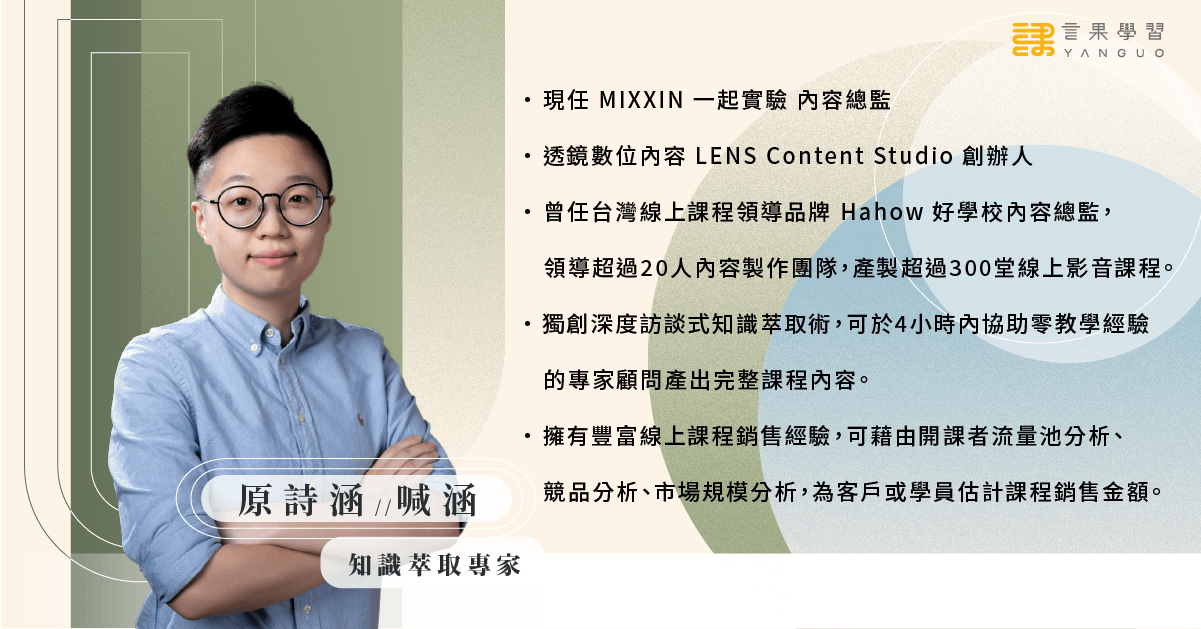 原詩涵(喊涵)老師擁有 7 年以上台灣線上教育經驗,熟悉台灣線上課程、知識變現市場。曾任台灣線上課程領導品牌 Hahow 好學校內容總監,領導超過 20 人的內容製作團隊,產製超過 300 堂線上影音課程。 獨創深度訪談式知識萃取術,可於 4 小時內協助零教學經驗的專家顧問產出完整課程內容。同時擁有豐富線上課程銷售經驗,可藉由開課者流量池分析、競品分析、市場規模分析,為客戶或學員估計課程銷售金額。 2020 年創辦「透鏡數位內容 LENS Content Studio」,業務包含知識萃取、線上影音課程製作、企業內訓與講師數位轉型輔導。2024 年初,團隊經台灣頂尖的群眾集資顧問公司 MIXXIN 一起實驗收購,目前於 MIXXIN 擔任內容總監。