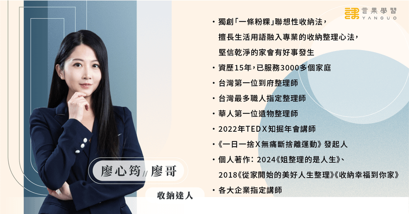 本場講座特別邀請全台第一位「到府收納整理師」、有「收納達人」之稱——廖心筠 (廖哥) 老師,分享「收拾一次不復亂」的關鍵秘訣!帶你正確認識斷捨離、找到你的收納習慣,並且掌握整理四步驟,無論是為年前大掃除做準備,或想打造長期舒適的生活空間,你都將學習到生活的收納心法與整理技巧,讓今年的整理不再是痛苦任務,而是迎接嶄新一年的最佳禮物!