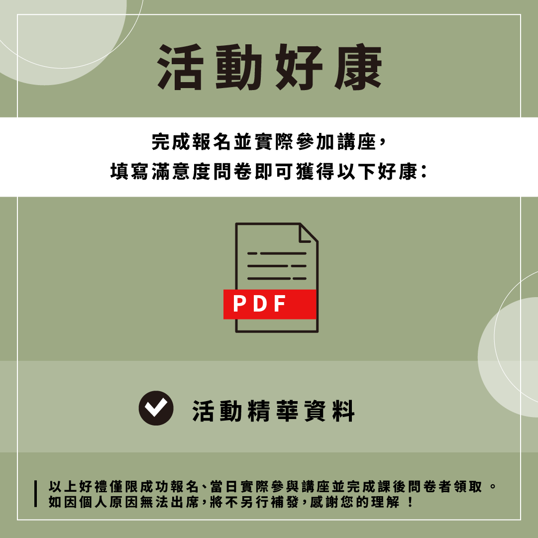 📢 以上好禮僅限成功報名、當日實際參與講座並完成課後問卷者領取。如因個人原因無法出席,將不另行補發,感謝您的理解!