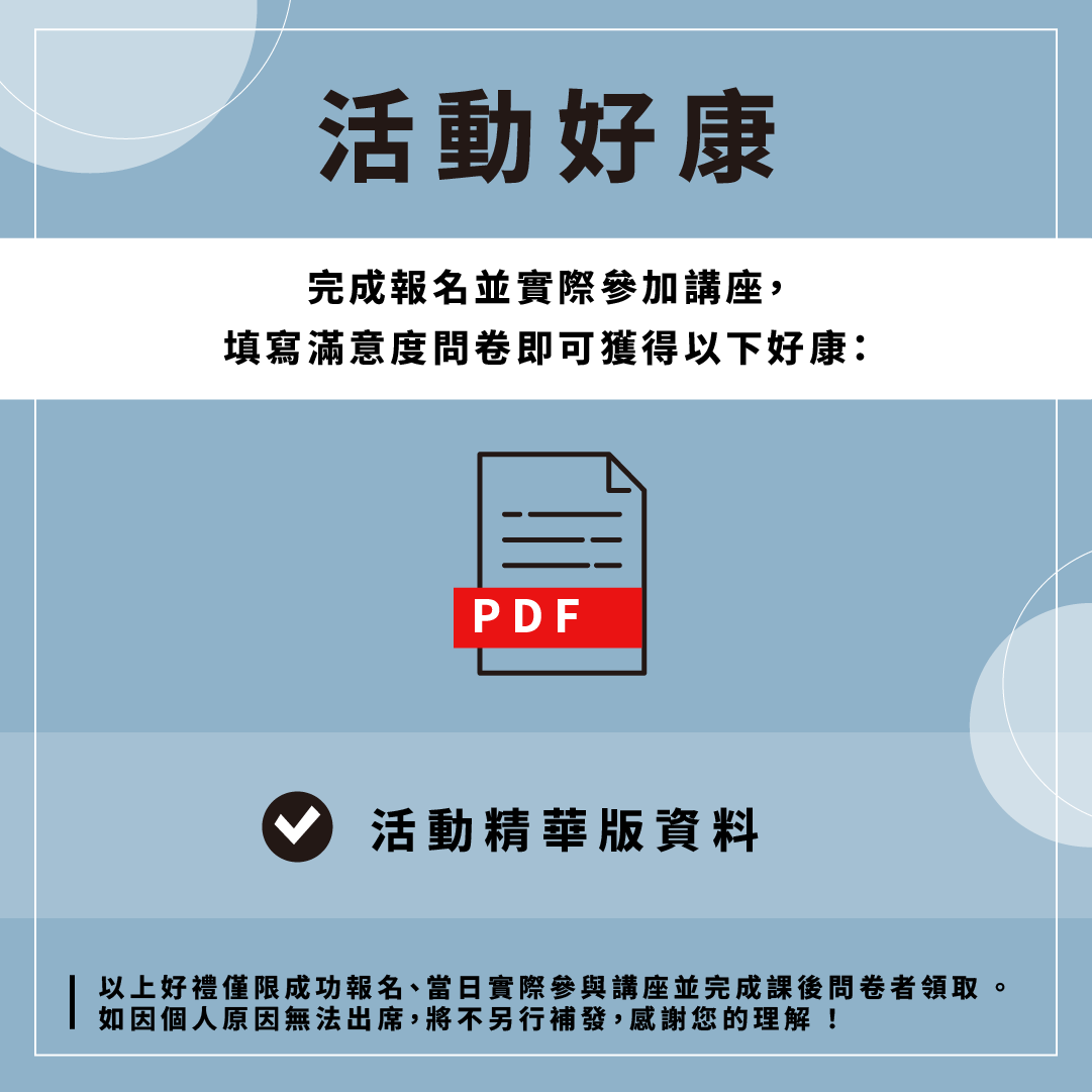 📢 以上好禮僅限成功報名、當日實際參與講座並完成課後問卷者領取。如因個人原因無法出席,將不另行補發,感謝您的理解!