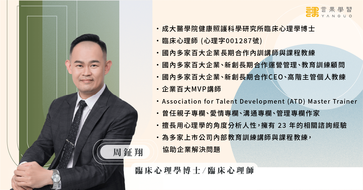 周鉦翔(周老師)為研究與實務經驗豐富的心理學博士,本身亦為臨床心理師,擅長用心理學的角度分析人性,同時擔任企業內部訓練講師,用心理學的角度協助企業解決問題。 在課程中,周鉦翔老師以臨床心理學博士的專業知識為基礎,結合19年的心理諮詢和10年的企業講師經驗,為學員提供精準的指導。老師的授課風格時而睿智理性,時而魅力感性,透過引人入勝的講授影響力,穿透並串聯學員的學習欲望,同時引發熱忱與投入,提高學習績效。 周鉦翔老師在課堂中活潑生動,注重小組討論和互動,並巧妙運用技巧演練、PBL及Q&A手法。這些教學手法不僅引發學員的反思和自省,還能整合既有的專業知識,啟發學員的學習潛能。